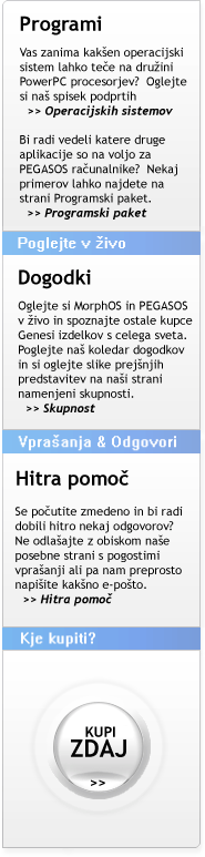 V prihodnosti obstaja velika možnost, da bodo novi procesorji tako iz IBM-a kot tudi iz Motorole našli pot do Pegasos osnove. Genesi se je podal na pot alternativnega računalniškega trga z močno osnovo za delo, ne samo za danes ampak tudi za prihodnost. Zahvaljujoč modularni naravi Pegasosa, vaša investicija ne bo izgubljena z naslednjim tehnološkim korakom. Pegasos - narejen danes, pripravljen za jutri! |